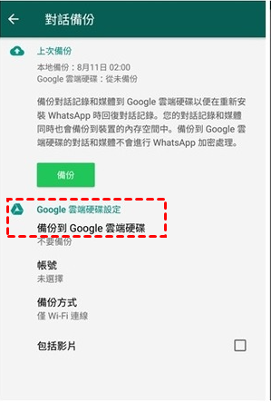 通常 Android 備份 WhatsApp 的首選工具是 Google Drive,您可以在設定中查看到這項選項。此外,WhatsApp 提供不同時段的備份頻率,比如每天、每週、每月。