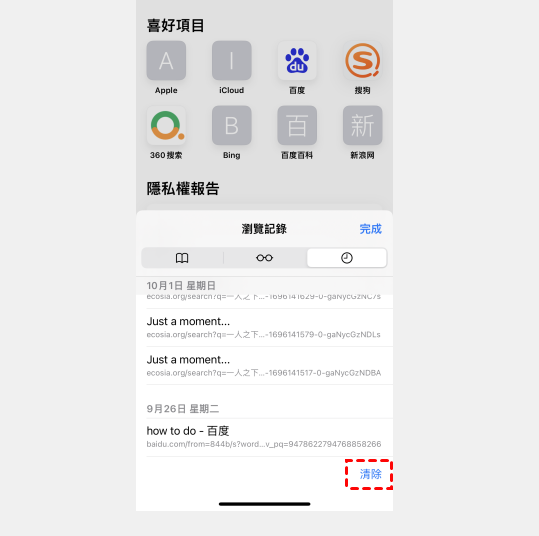 在Safari應用程式中,選擇螢幕底部的書籤圖示 > 切換到歷史記錄標籤 > 點一下清除並選擇一個持續時間 - 過去一小時、今天、今天和昨天或所有時間。