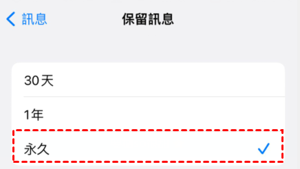 - 選擇30 天將自動刪除超過1個月的簡訊;選擇1年將刪除超過一年的郵件。