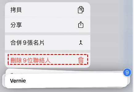5. 要刪除選定的聯絡人,請用一根手指按住任意突出顯示的聯絡人。從出現的下拉菜單中,點一下刪除 [X] 聯絡人選項。