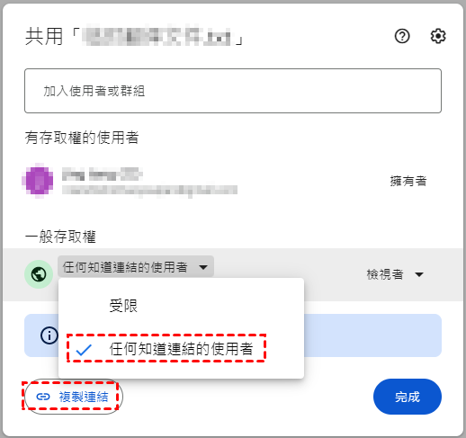 2. 在一般存取權處選中任何知道連結的使用者以設定訪問權 > 點擊複製連結。