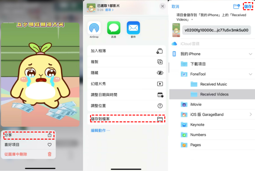 1. 在 iPhone 上打開照片影片程式 > 找到您想分享的影片 > 長按影片 > 點擊分享。