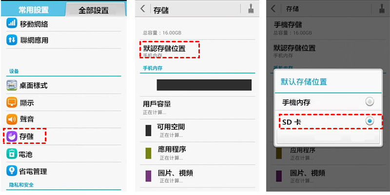 2. 轉到裝置儲存 > 在默認儲存位置處選中 SD 卡。