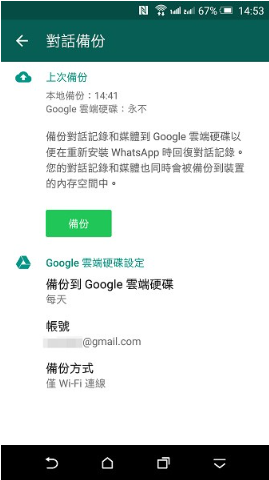 1. 在 Android 上啟用 WhatsApp > 設定 > 對話 > 備份。