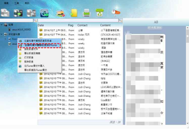 3. 將iPhone連接到電腦,右鍵點擊Android裝置,然後選擇訊息並傳送到iPhone。