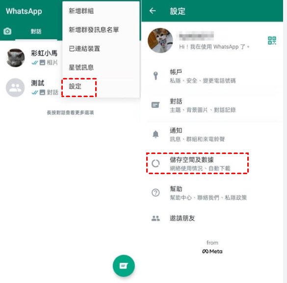 打開 WhatsApp > 點擊右上角的三點 > 選取設定 > 然後選取儲存與數據 > 選取要下載的媒體檔案。