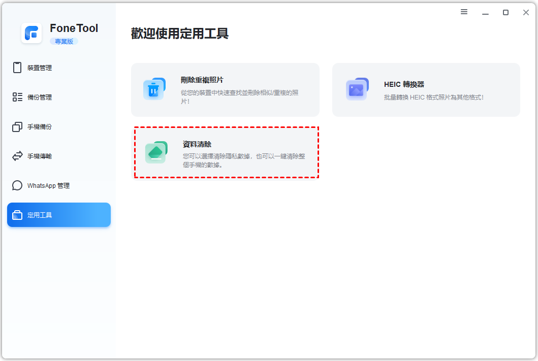 連接您的iPhone到電腦,點一下定用工具 > 選中資料刪除。