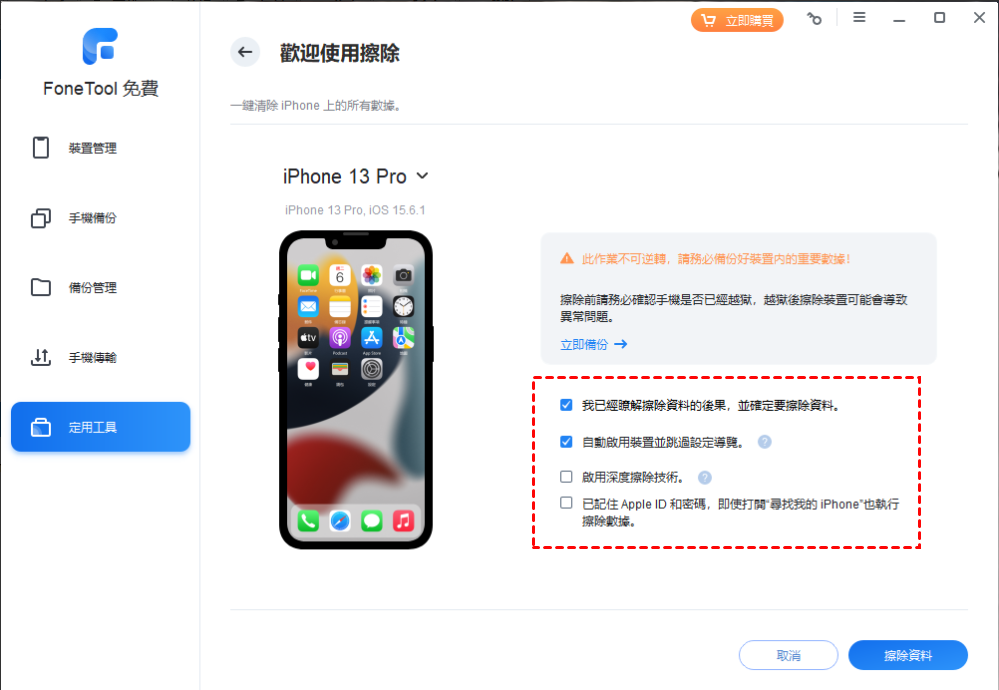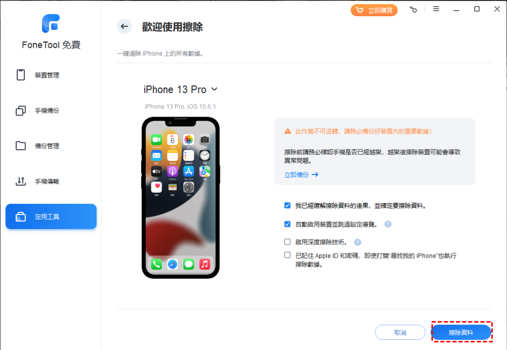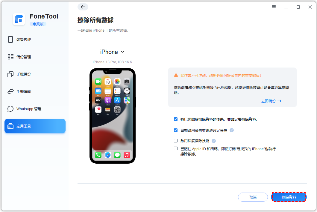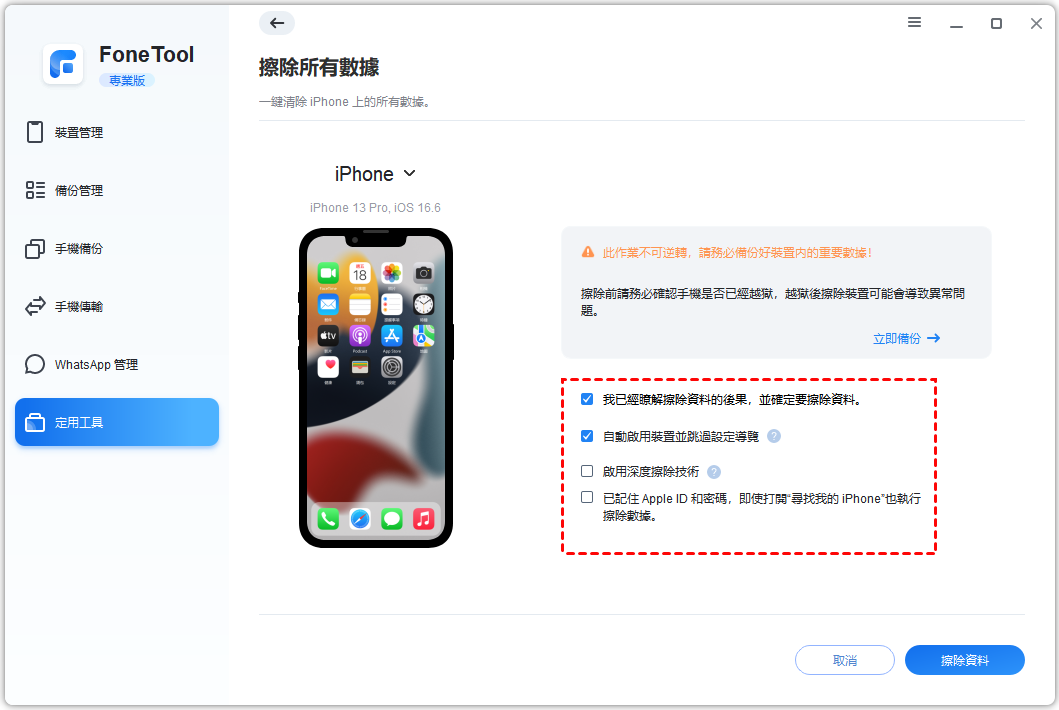 FoneTool適應各種需求。例如,您可以選擇將iPhone恢復原廠設定或完全擦除數據,並決定刪除後是否保留Apple ID。