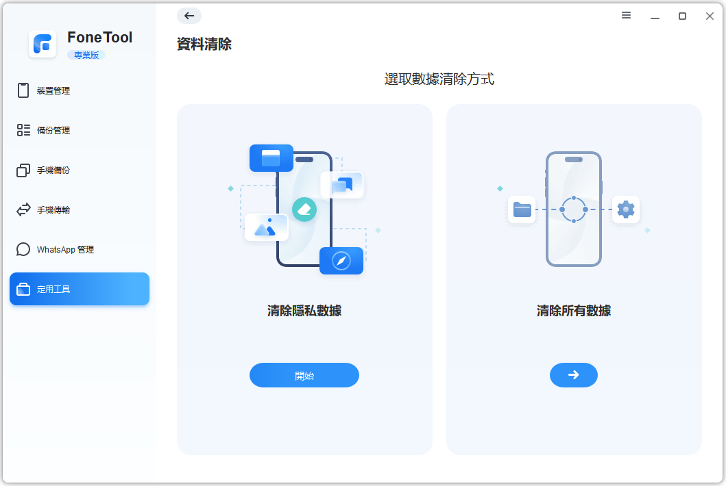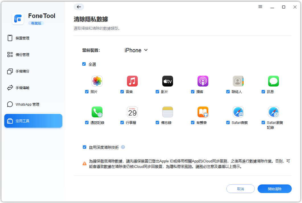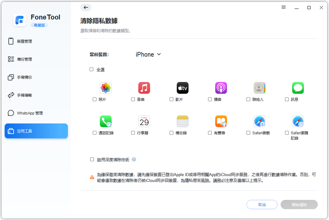FoneTool提供深度清除技術來完全永久地刪除所有內容或選定的數據。當您出售或贈送您的iPhone時,最好啟用它。
