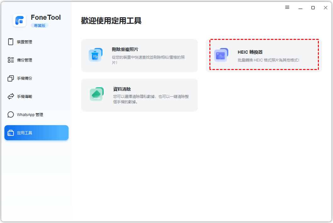 在FoneTool上,點一下定用工具 > 選中HEIC轉換器。