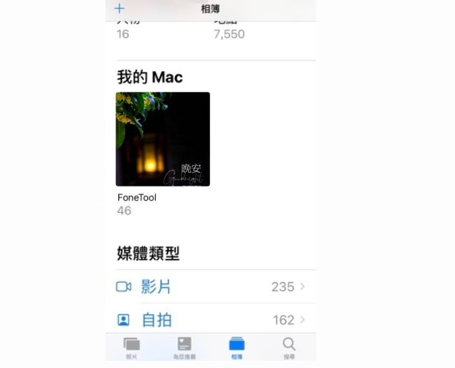 以第二種方式傳輸到iPhone的照片可以在「照片」應用程式的「我的Mac」類別中找到,儲存在FoneTool相簿中。透過其他第三方軟體傳輸的照片也可能儲存在「我的Mac」類別下,例如相簿A、相簿B。「我的Mac」類別下相簿中的所有照片都無法在iPhone上刪除或編輯。