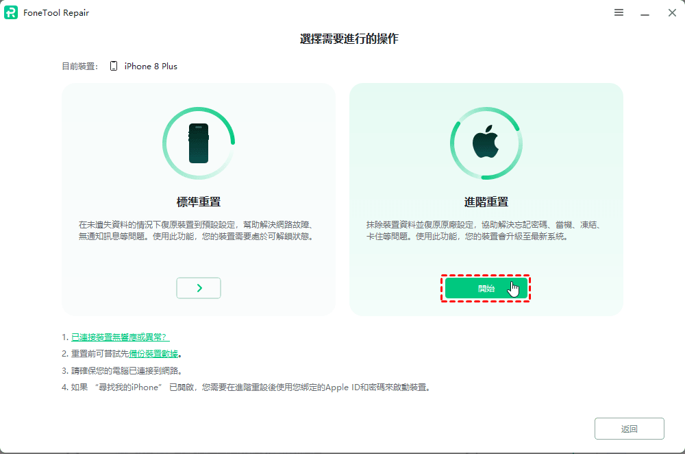 2. 如果您希望重置裝置並保留所有數據,請選取左側的標準重置,然後點擊開始 > 在繼續之前,請確保您的iOS裝置已解鎖。