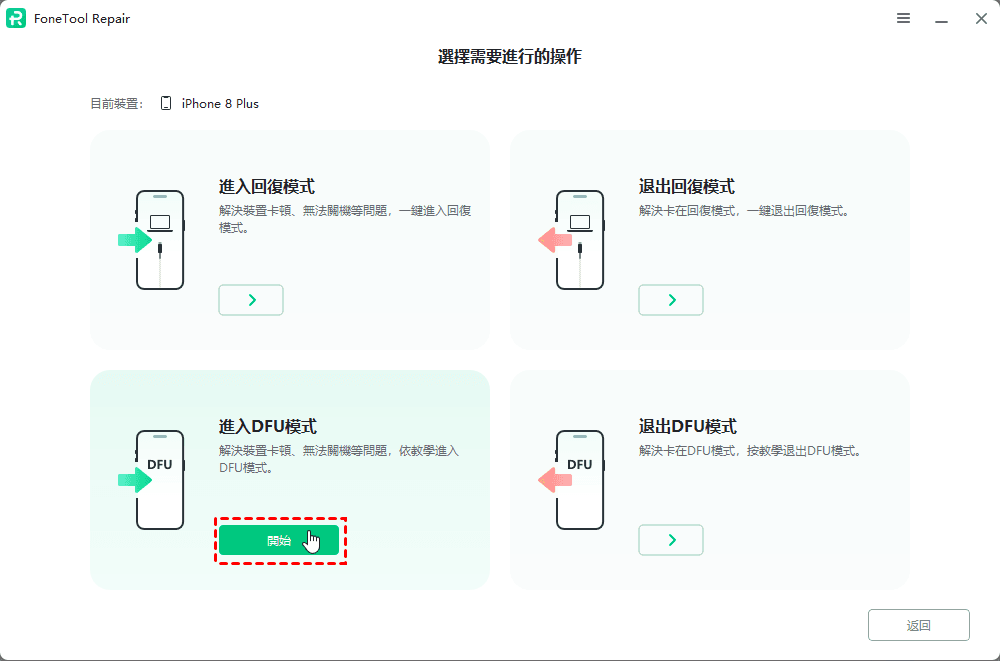 4. 若要進入DFU模式,請選取左側的選項之一。