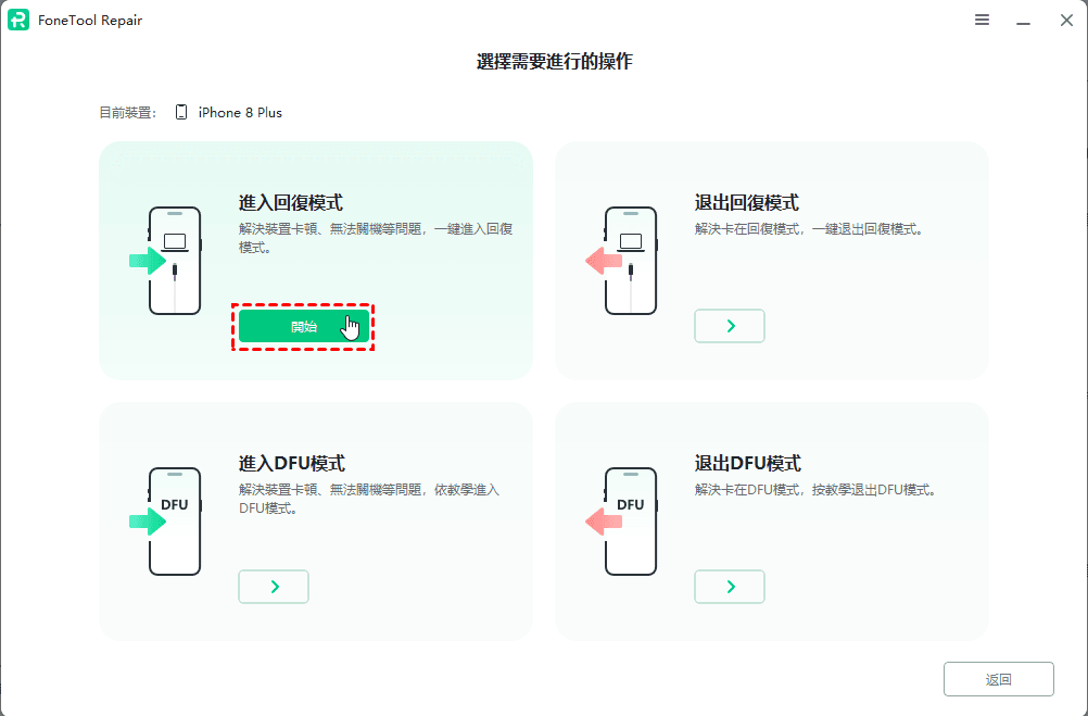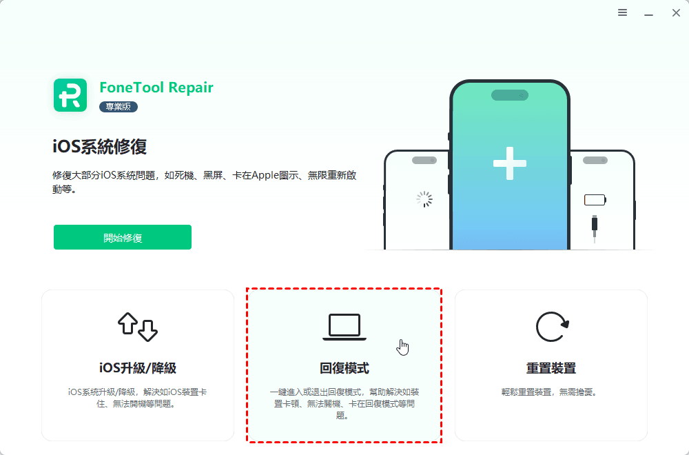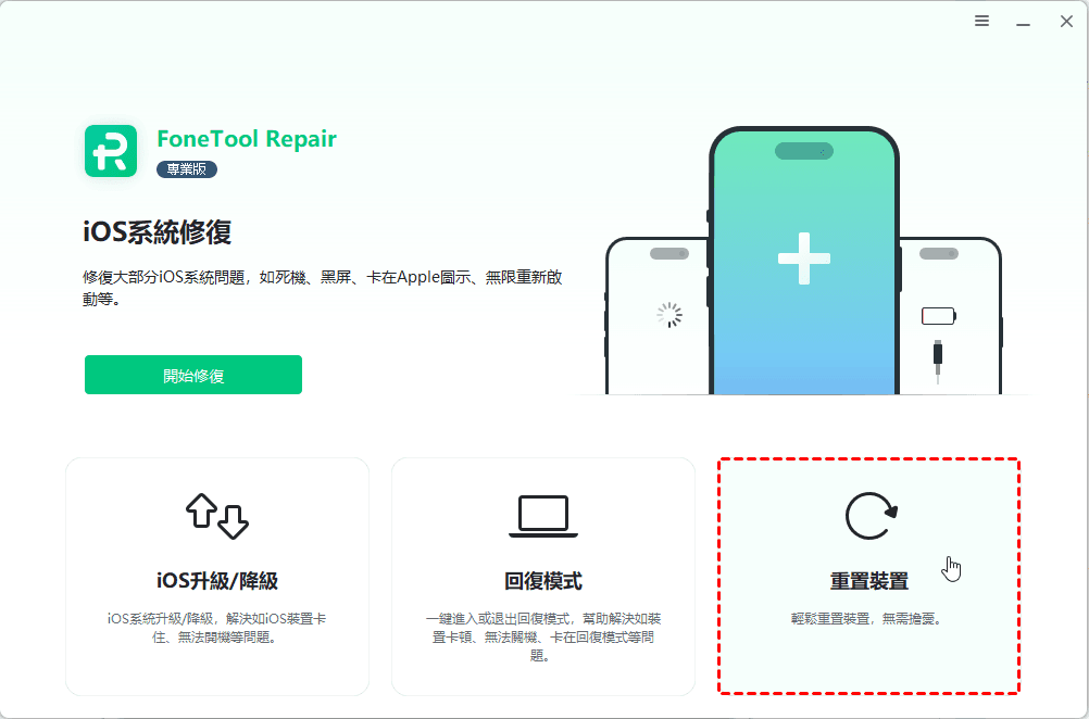 3. iOS系統修復工具提供了四個主要功能,在接下來的內容中將對每個功能進行詳細說明。確保您的iOS裝置在整個修復過程中始終保持連接到執行 FoneTool Repair 的電腦。