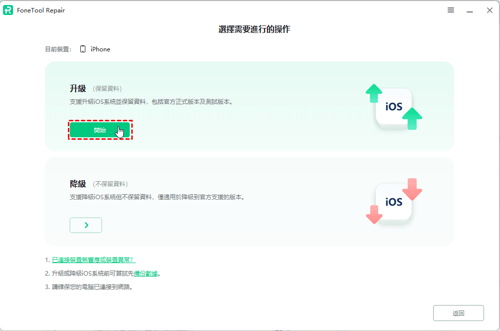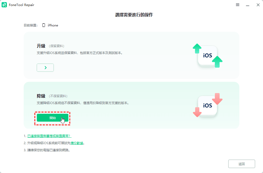 4. 若要降級,請選取降級選項,然後點擊開始。