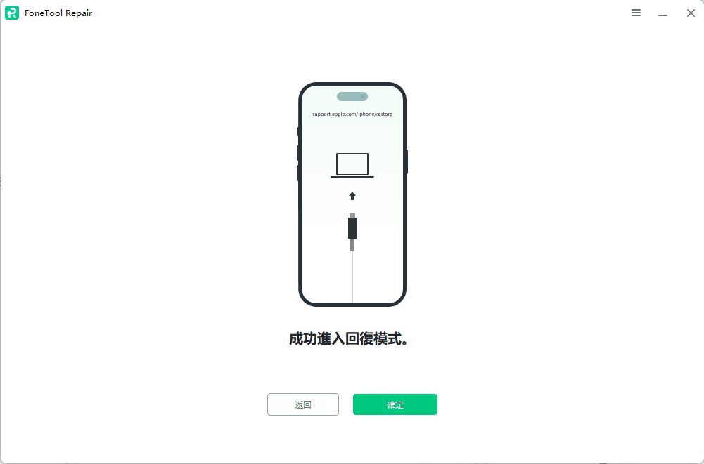 3.成功進入回復模式後,點選確認返回 > 您的iOS裝置現在處於回復模式。