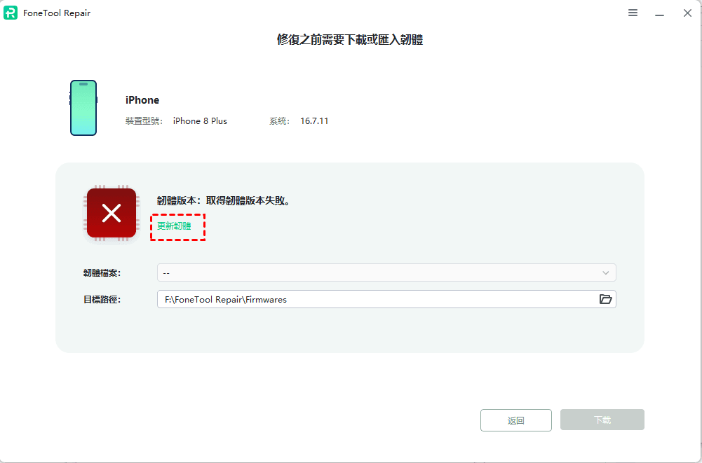提示:如果您已經下載了韌體,但由於網路問題出現錯誤提示,請關閉錯誤提示,然後點擊更新韌體重新下載韌體。