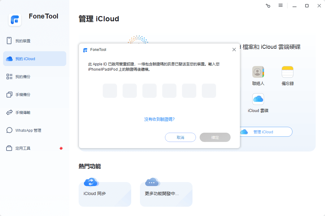 首次使用 FoneTool 中的“管理 iCloud”功能並輸入 Apple ID 帳戶密碼進行繫結時,系統會提示您輸入雙重驗證碼(如下圖所示)。您可能會疑惑,FoneTool 中為何需要進行雙重驗證?它的目的是什麼?本文旨在為您介紹 Apple ID 雙重認證的概念。
