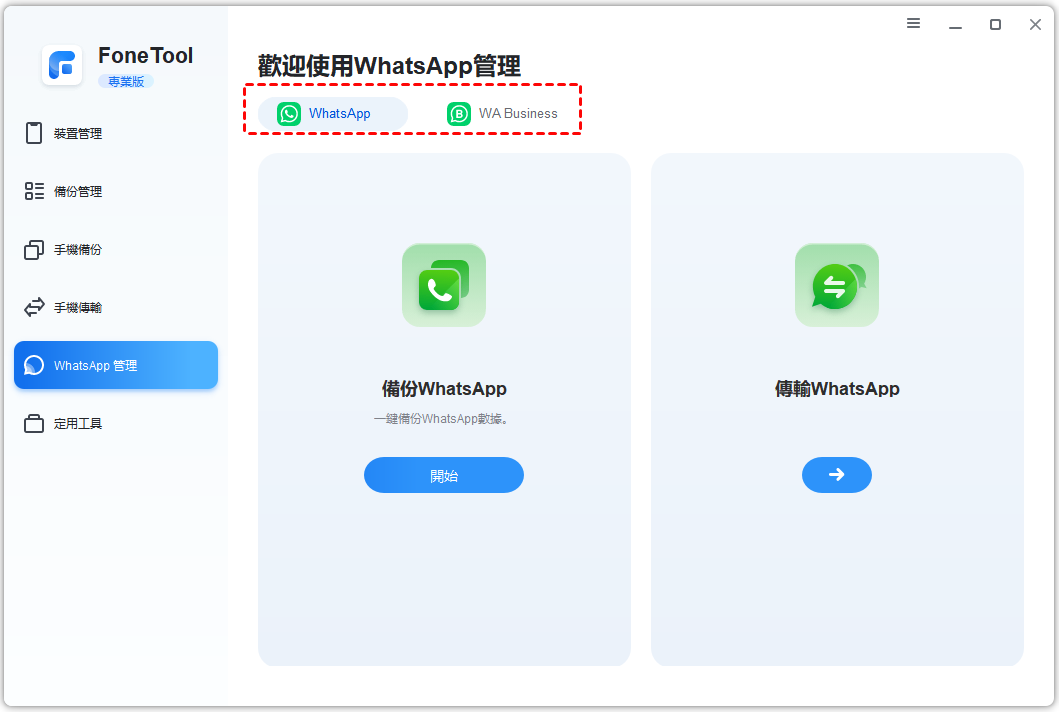 步驟1. 啟動FoneTool,然後點選左側選單列上的「WhatsApp管理」。並且,根據您使用的帳戶類型選擇「備份WhatsApp」或「備份WhatsApp Business」。