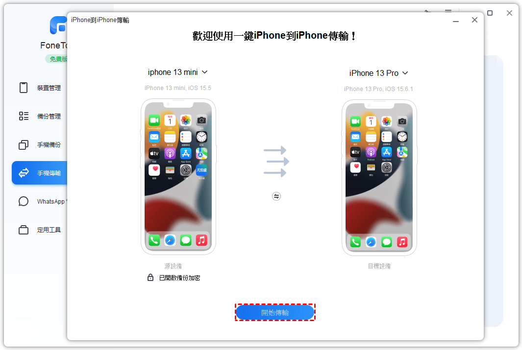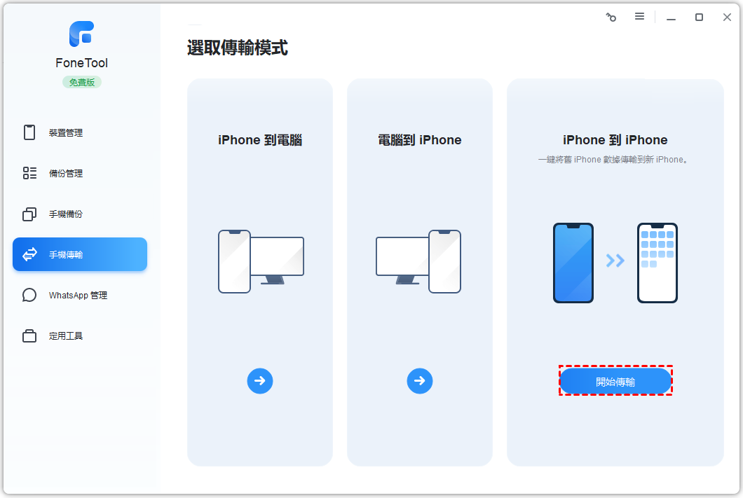 點一下 手機傳輸 ,然後選取 iPhone到iPhone , 點一下開始傳輸 。