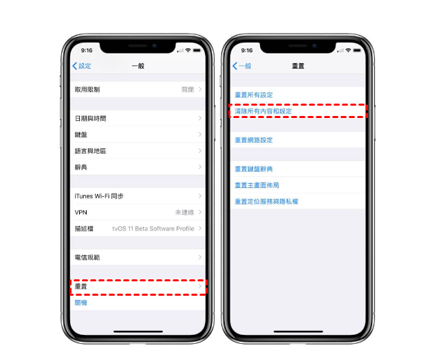 選擇重置點一下清除所有內容和設定。