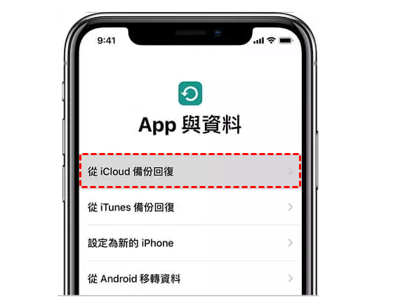 重新啟動新iPhone > 加入Wi-Fi > 選取從iCloud備份回復