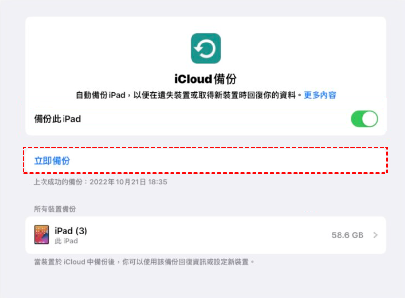 如果您想立即將iPad備份到iCloud,則需要手動點一下立即備份以立即執行備份任務。