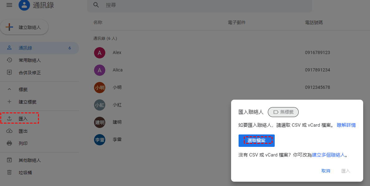 2. 在左側菜單欄中,點擊匯入 > 選取檔案,將備份到電腦的聯絡人備份到Google Contacts。