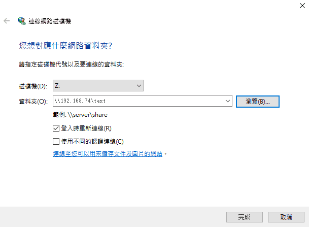 2. 選取您喜歡的磁碟機號,磁碟機號一般預設為“Z”,點擊瀏覽按鈕從NAS選取路徑,這部需要使用者名和密碼。