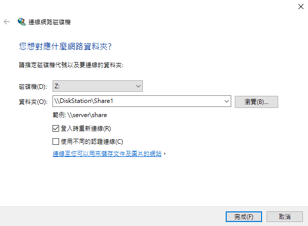 3. 選取一個磁碟機編號,在資料夾欄位中輸入Synology NAS的伺服器名稱和共享資料夾名稱,如:Synology NAS的伺服器名稱為DiskStation,共用資料夾名稱為Share1,您應該輸入\\DiskStation\Share1。