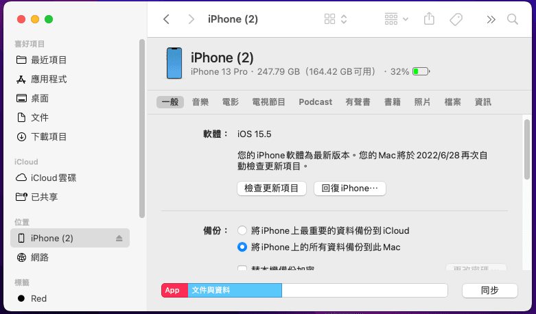 3. 在一般選項下選取將iPhone上的所有資料備份到此Mac,點擊同步,之後iPhone就會備份到Mac。