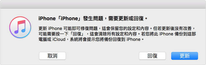 4. 出現詢問是否回復或更新裝置時點擊回復。