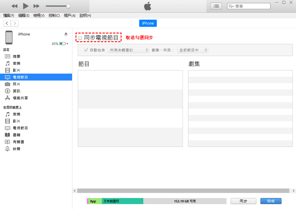 2. 在裝置下,選擇您要停止同步的內容類型。這裡我們以電視節目為例。