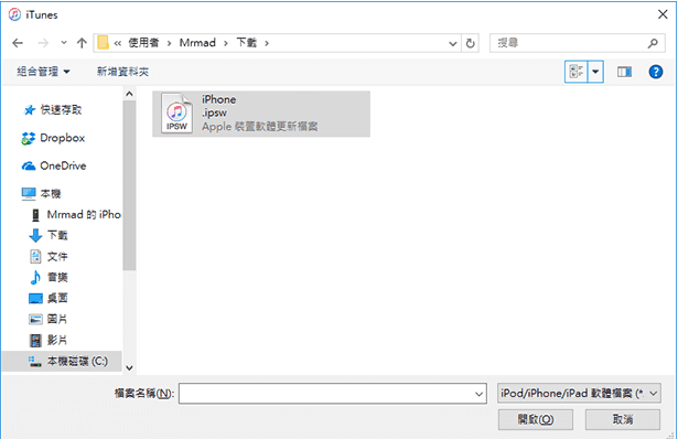 3. 選擇IPSW檔案並單擊開啓 > 將出現一個彈出視窗並告訴您 iTunes 會將您的裝置回復到 iOS 15.5,單擊回復確認。