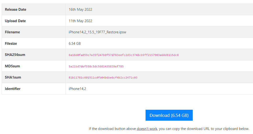 1. 從 Apple IPSW 處下載 iOS 15 固件檔案:在 https://ipsw.me/ 中選擇適合您的iPhone類型和您需要的 IPSW(現在,只有 iOS 15.5 可用) > 點擊下載。