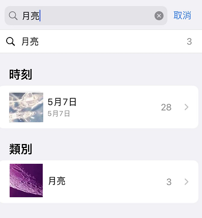 按關鍵字搜尋:打開照片應用程式 > 點擊搜尋 > 在搜尋欄中鍵入一個關鍵字以鎖定人物、地點等。