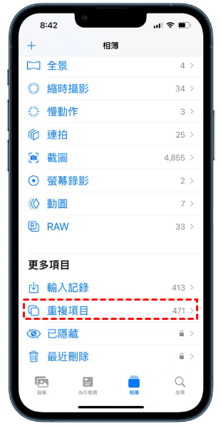 2. 打開照片應用程式 > 點擊相簿 > 點擊重複選項。