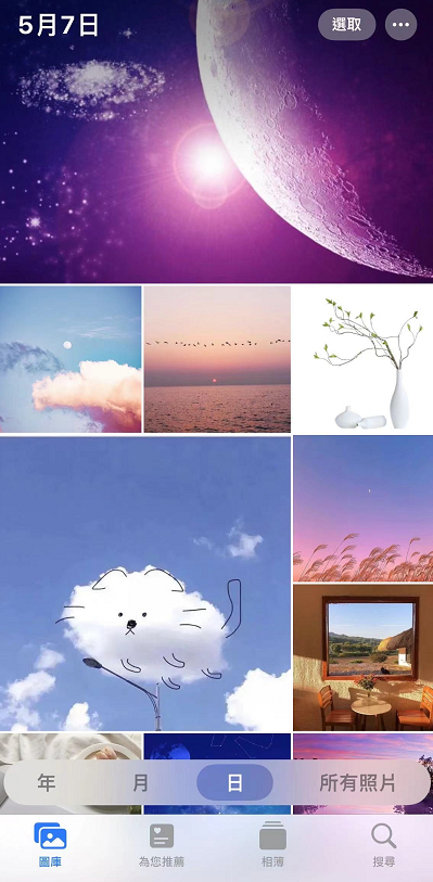按日期查看:打開照片應用程式 > 點擊圖庫 > 選擇日。