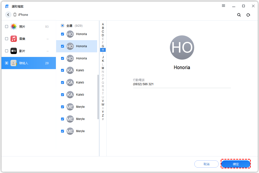 2. 點擊聯絡人 > 選取需要傳送到電腦的聯絡人 > 點擊確定。