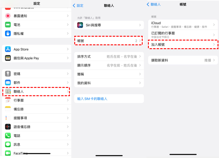 1. 轉到iPhone設定 > 點擊聯絡人 > 點擊賬戶 > 點擊加入賬號。