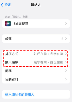 - 排序方式:名字在前,姓氏在後或姓氏在前,名字在後。