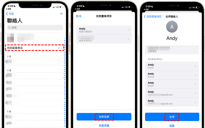 3. 如果你有重複聯絡人的話,這裡會顯示找到重複項目,直接點進去然後選擇合併全部,或者你也可以點進重複聯絡人裡合併。