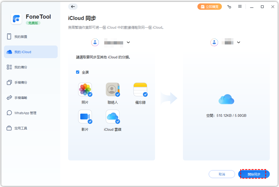 如果您想更快且還不用來回切換Apple ID登入轉移資料,FoneTool是您最好的幫手。它的iCloud同步功能可以協助您將最重要的照片、影片、聯絡人、iCloud、備忘錄從一個Apple賬戶轉移到另一個Apple賬戶。