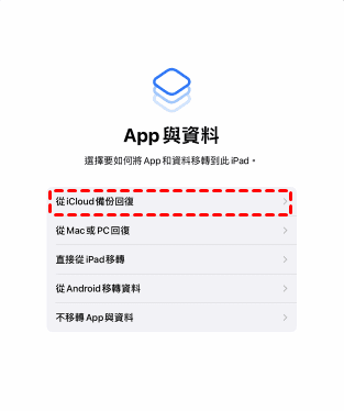 3. 打開您的新iPad並按照指南設定新iPad。在App與資料選項處點擊從iCloud備份回復。