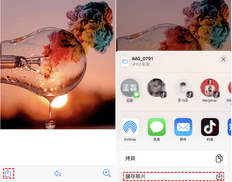 找到並點擊圖片 > 點擊共享按鈕 > 點擊儲存照片。