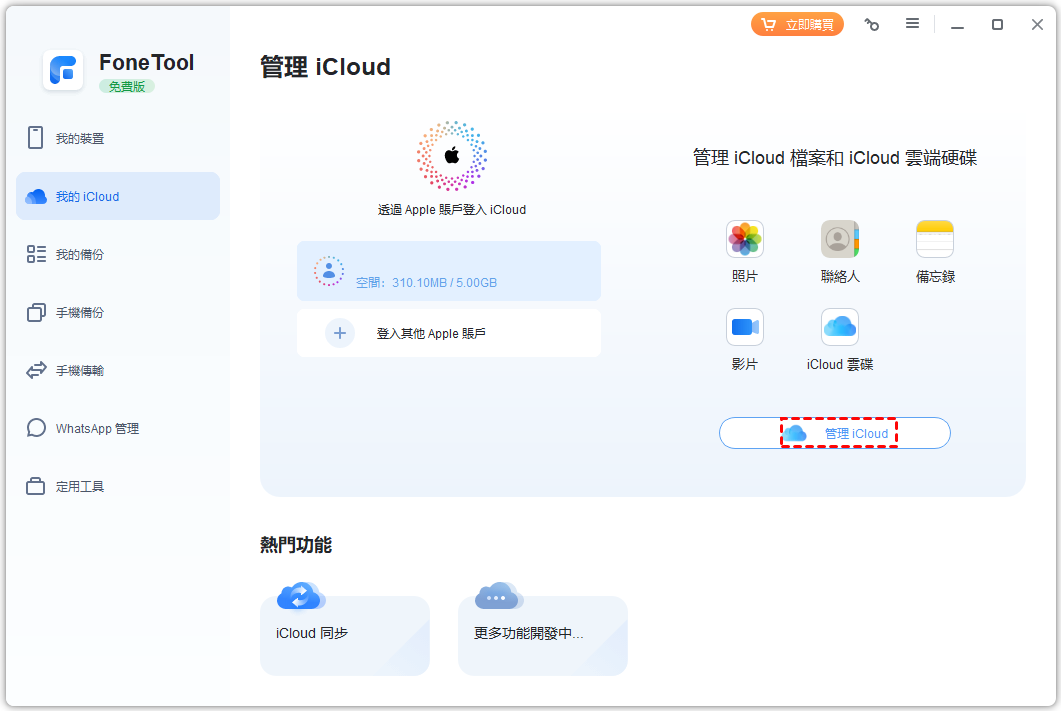 2. 從 PC 開啟 FoneTool > 前往我的 iCloud > 使用您的 Apple ID 登入 > 選擇管理 iCloud。