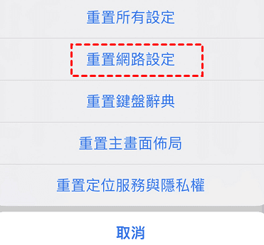 開啓iPhone設定 > 一般 > 移轉或重置iPhone > 重置 > 重置網路設定。