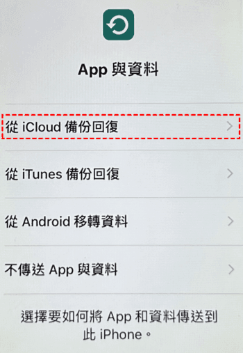 使用iCloud將數據傳輸到iPhone需要在您設定iPhone程式時,看到應用程式和數據選項後,選擇從iCloud備份回復,然後登入您的Apple ID賬戶和密碼,數據就會開始回復。