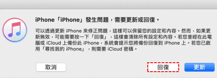 3. 啟動 iTunes,這時在iTunes上將彈出一條消息,顯示回復或更新選項。