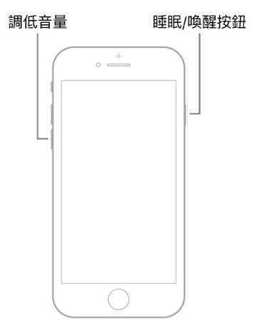 同時按下調低音量按鈕和睡眠/喚醒按鈕,直到出現 Apple 標誌,然後鬆開這兩個按鈕。